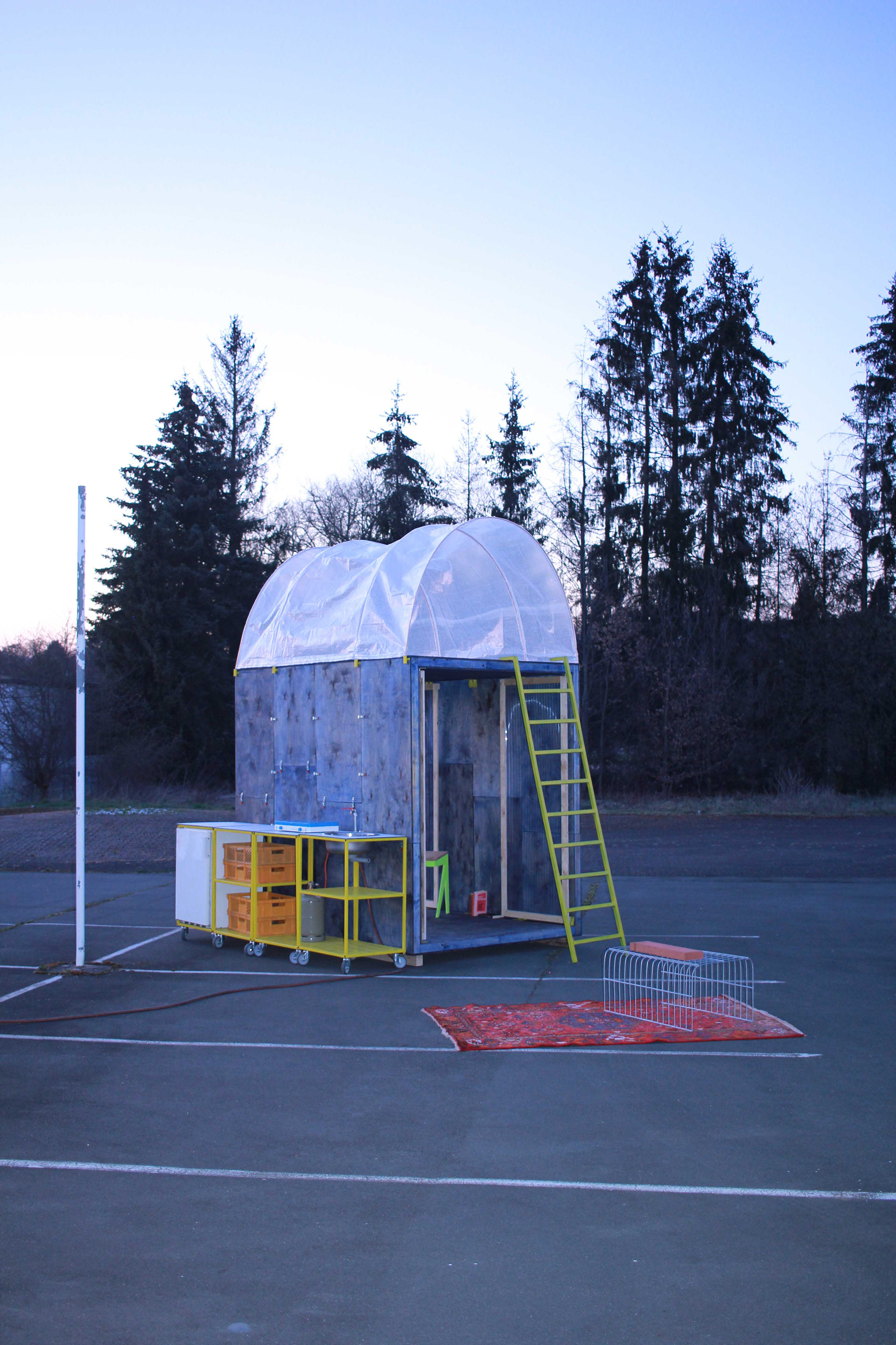 Das Raummodul provides an initial supply for human needs, it creates a universal comfort. Vacancy is the counterpart to our design basis, change. It offers space that is seen as useless. "The base" is composed of four modules, these thematize different tasks: working, eating and sleeping, as well as moving and staying. They are constructed as uniformly as possible and divided into manageable sizes, so they are each easy to transport and assemble. The result is a kitchenette, a study and a sleeping area. For the first appearance of the base resulted in a car dealership in Frankenberg, several contiguous halls and high rolling doors.
